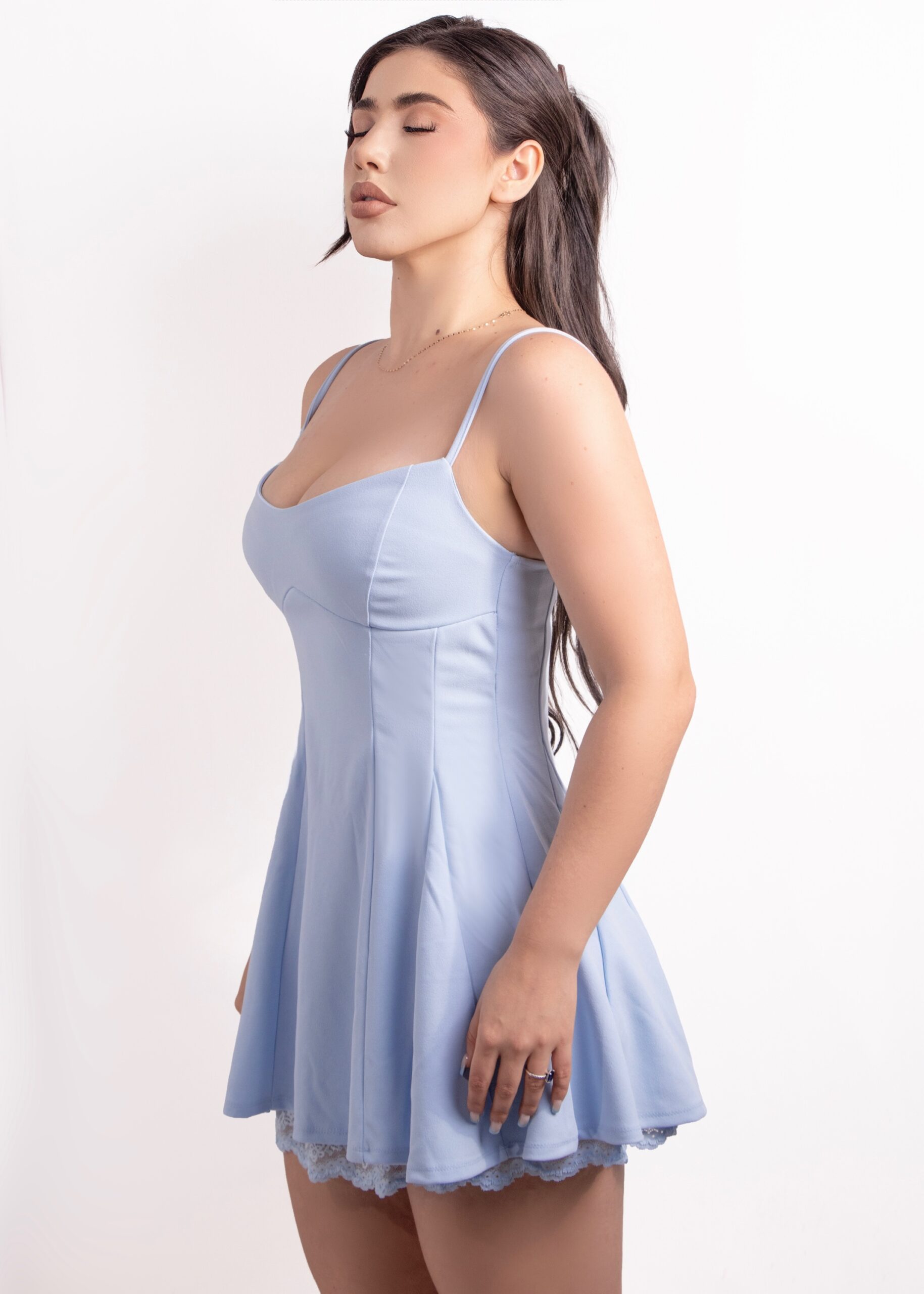 Vestido con tirantes y falda en caída suave que estiliza la figura. En la parte de abajo tiene detalle de encaje que le da un toque femenino y delicado. Cómodo, ligero y perfecto para un look dulce y elegante.
